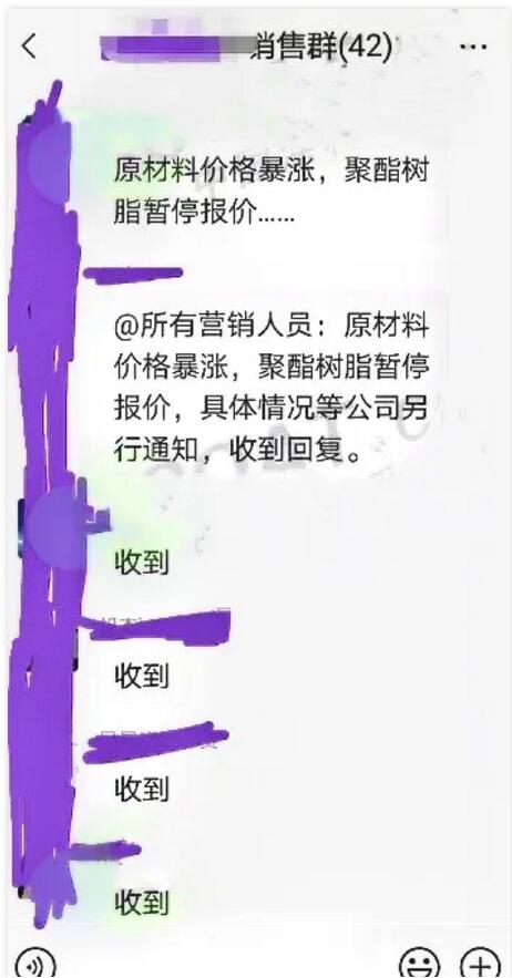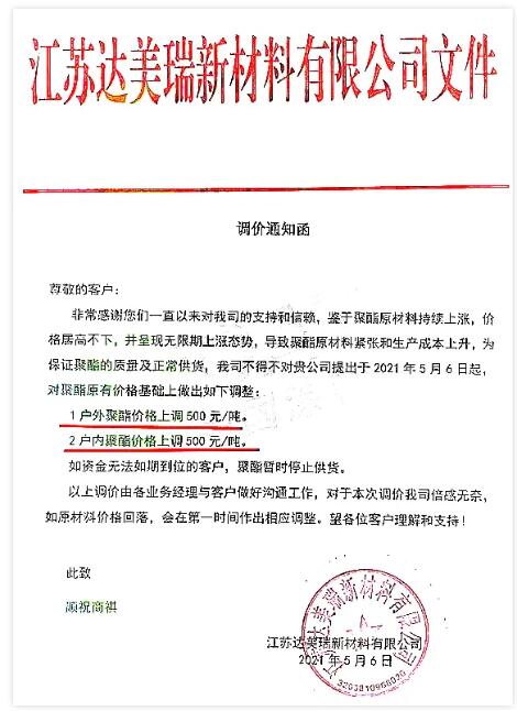 聚酯樹脂漲價500元/噸,多家企業暫停報盤 江蘇達美瑞新材料有限公司發函稱,戶外聚酯價格上調500元/噸,戶內聚酯價格上調500元/噸,如資金無法如期到位的客戶,聚酯暫時停止供貨。