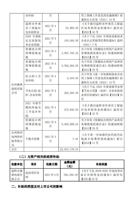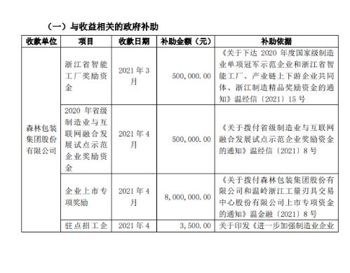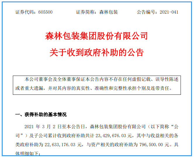 林包裝(SH605500)5月11日晚間發(fā)布公告稱,2021年3月2日至本公告日,森林包裝集團股份有限公司及子公司累計收到政府補助共計約2343萬元,其中與收益相關(guān)的各類政府補助約為2263萬元,與資產(chǎn)相關(guān)的政府補助約為80萬元。