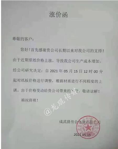 瀘州市一圣鴻包裝有限公司 從2021年5月17日起,按現執行價格上漲3%。  重慶協興包裝有限公司 從2021年5月17日起,板材現價格在執行價格基礎上上漲3%。