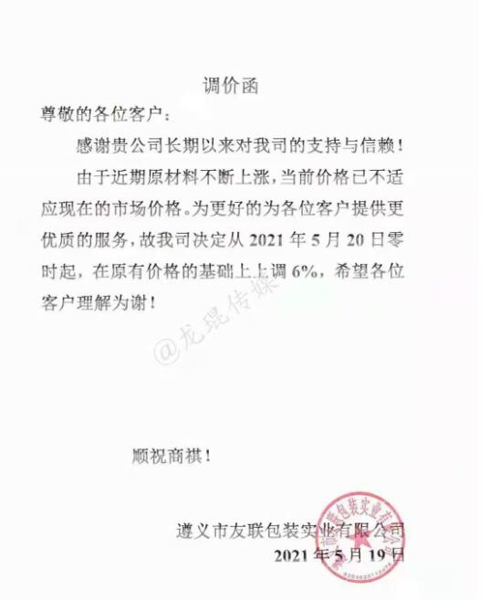 隨著玖龍紙業啟動第四輪漲價行動,包裝市場全面陷入漲價風潮。短短一天時間內,浙江、江蘇、湖南、江西、上海、天津等多個省市傳出數十張紙板漲價函。 與前期相比,新的紙板漲價潮無論是規模還是漲幅,均有較大提升。據統計,不少紙板廠已是第二輪乃至第三輪漲價,其中部分紙板廠還表示“不接受預付款保原價的訂單”;多數紙板廠漲幅為5%,漲幅相對較低的亦有3%,高的甚至達到10%。 新的漲價潮,帶動著生產成本上升。紙箱廠務必要及時與終端客戶溝通,爭取在最大程度上轉移成本壓力,從而避免自身經營受到嚴重影響。 貴州省 遵義市友聯包裝實業有限公司 從2021年5月20日零時起,在原有價格基礎上上調6%。