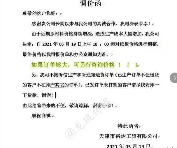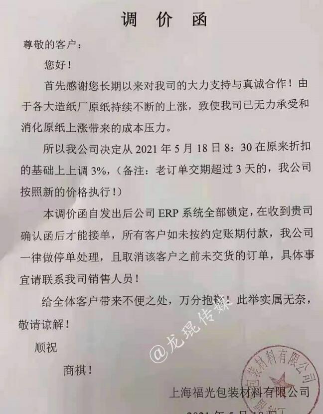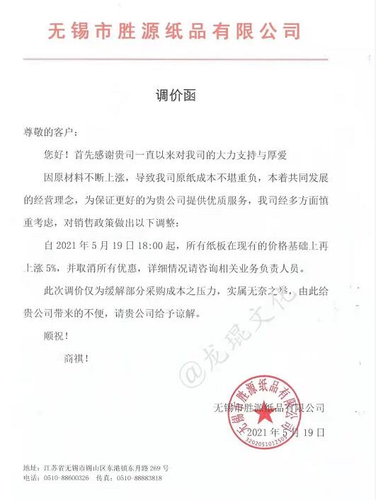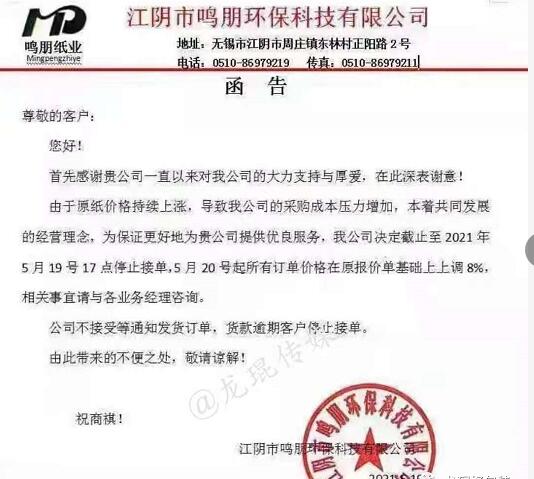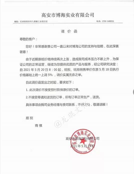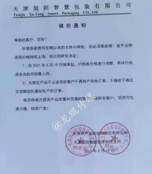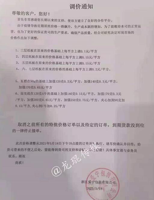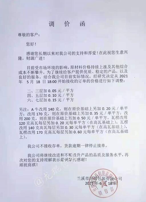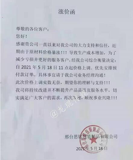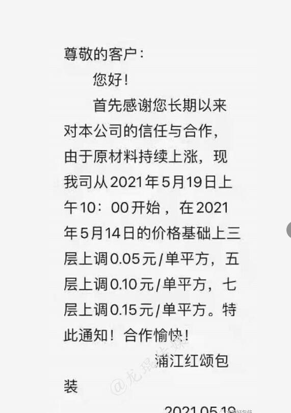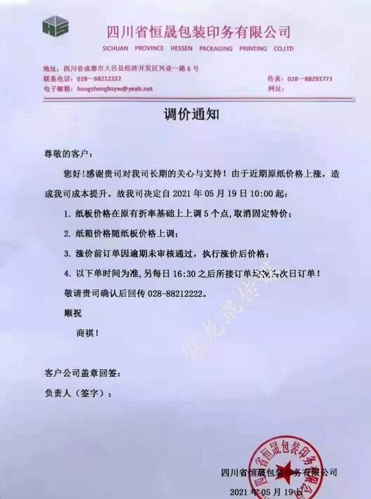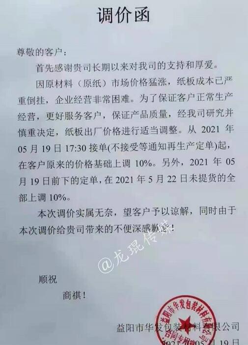 益陽市華發包裝材料有限公司 從2021年5月19日17點半接單起,在客戶原來價格基礎上上漲10%。另,5月19日前下的訂單,在5月22日未提貨的全部上調10%。