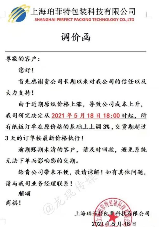 上海博菲特包裝科技有限公司 從2021年5月18日18點開始,所有紙板訂單在原價格基礎上上漲3%。