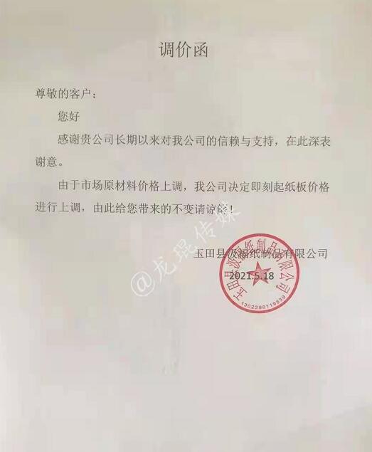 玉田縣汲福紙制品有限公司 由于市場原材料價格上漲,公司決定即刻起上漲紙板價格。