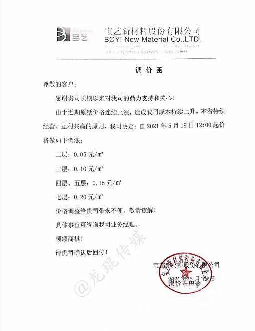 湖南龍發包裝有限公司 從2021年5月19日18點接單起,紙板價格在現有價格基礎上上漲5%(折扣)。