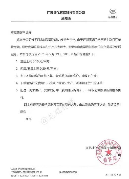 鹽城弘泰紙品包裝有限公司 從2021年5月20日凌晨起,兩層、三層上調0.05元/每平方,四層、五層上調0.10元/每平方,六層、七層上調0.15元/每平方。
