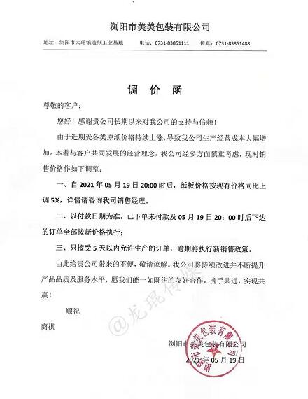 瀏陽市金信包裝有限公司 從2021年5月20日8點開始,二、三、四、五層紙板、紙箱在現有折扣基礎上上漲4個點。  瀏陽市美美包裝有限公司 從2021年5月19日20點開始,紙板價格在現有價格同比上漲5%。