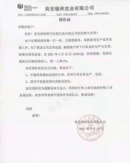 江西省 高安德和實業有限公司 從2021年5月19日18點開始,所有紙板、紙箱在原執行價格基礎上統一上調5%。