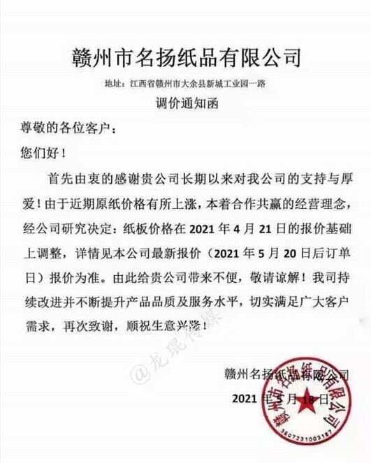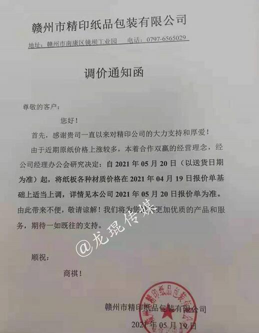 贛州市裕華包裝科技有限公司 從2021年5月20日起,將紙板、紙箱銷售價格在原報價單基礎上上調。