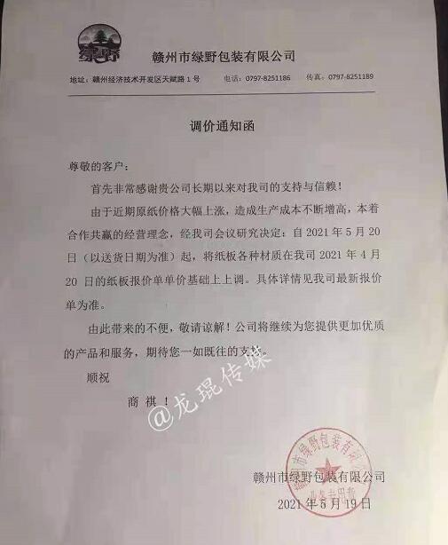 贛州市綠野包裝有限公司 從2021年5月20日起,將紙板各種材質價格在原報價單基礎上適當上調。