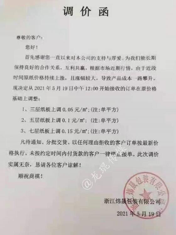 浙江煒晟包裝有限公司 從2021年5月19日12點開始,三層紙板上漲0.05元/單平方,五層紙板上漲0.1元/單平方,七層紙板上漲0.15元/單平方。