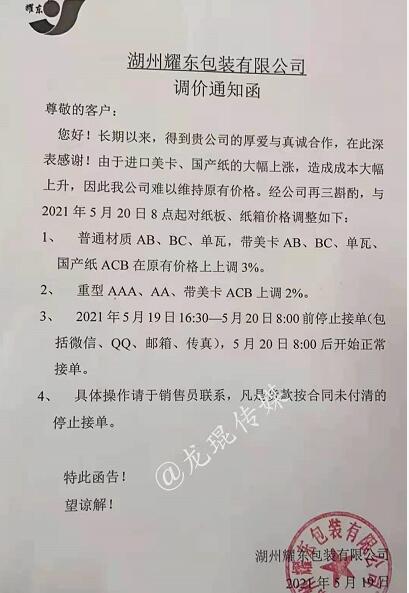 湖州耀東包裝有限公司 從2021年5月20日8點開始,普通材質AB、BC、單瓦,帶美卡AB、BC、單瓦、國產紙ACB在原有價格基礎上上漲3%,重型AAA、AA、帶美卡ACB上調2%。