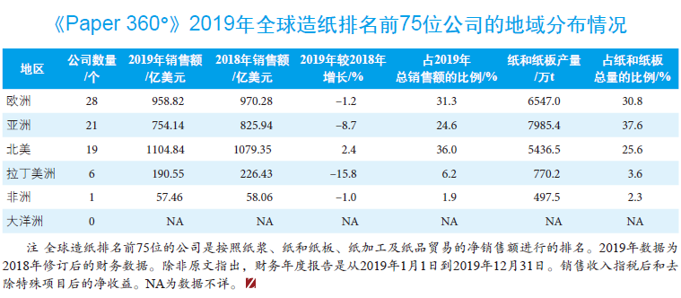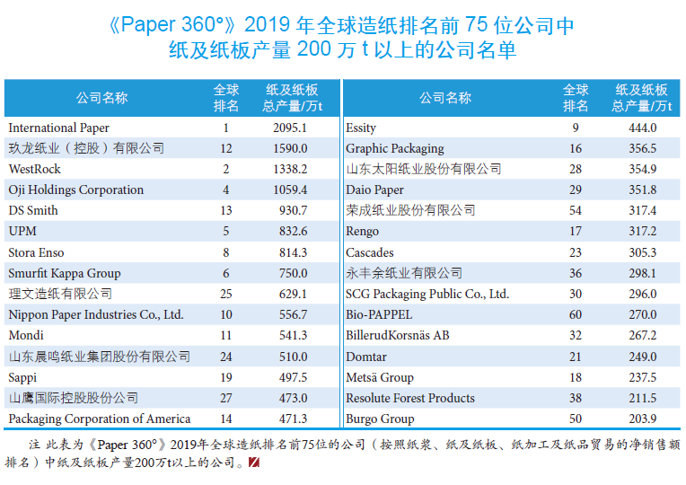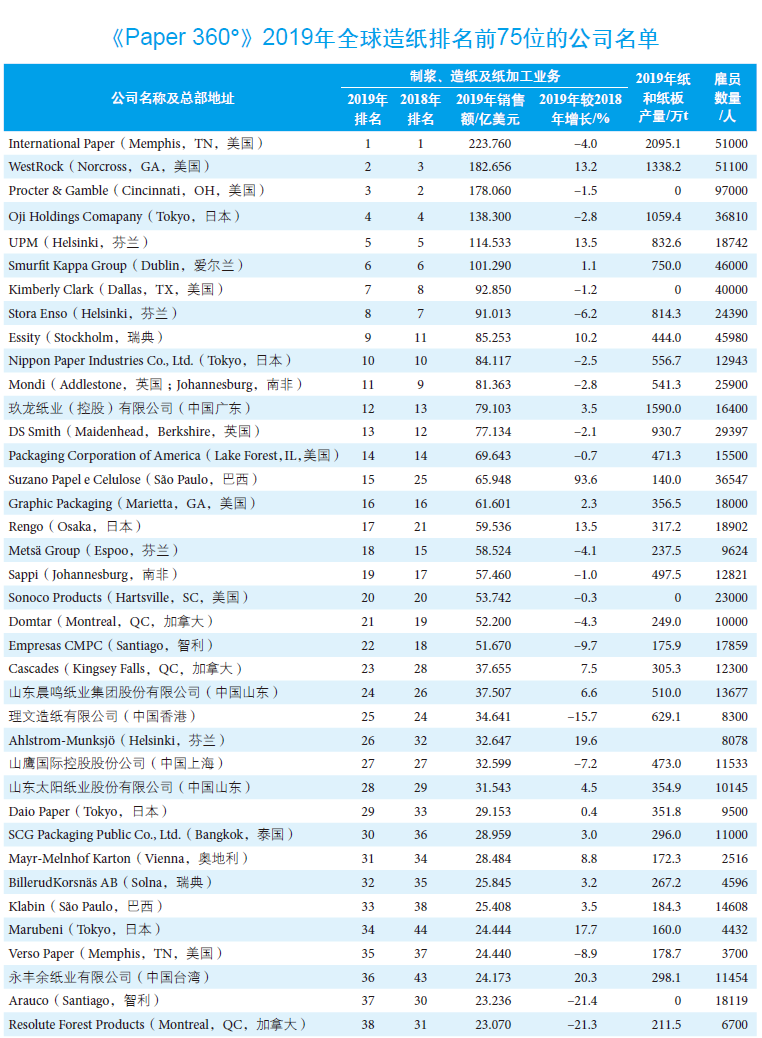《Paper 360°》2019年全球造紙排名前75位的公司名單