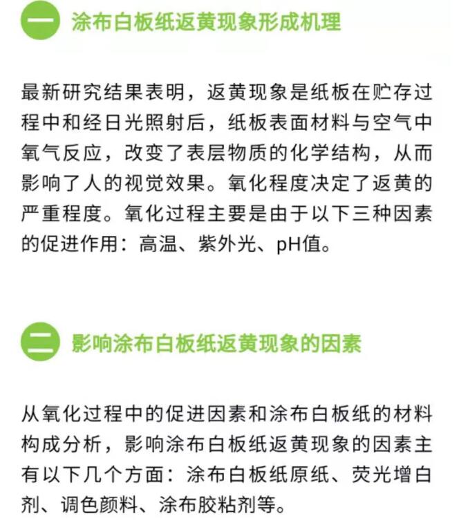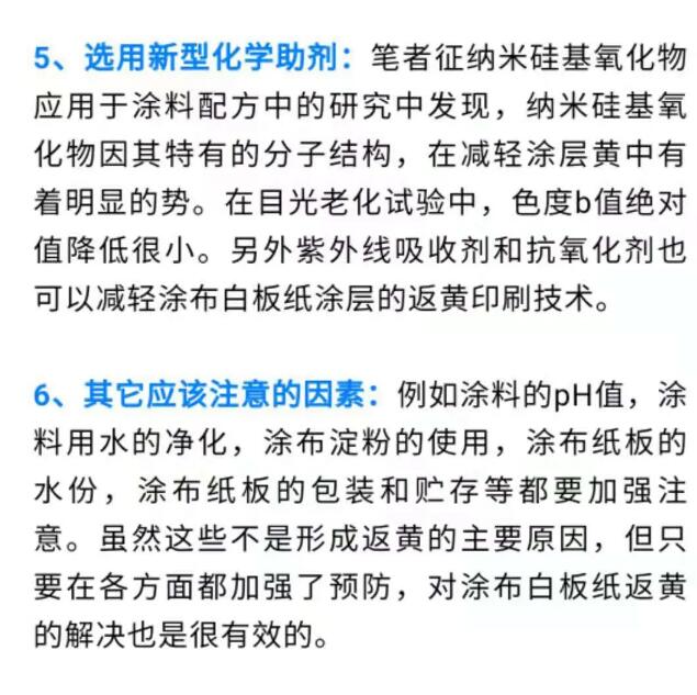 結論 1、在解決涂布白板紙返黃問題的生產實踐過程中,涂布原紙、熒光增白劑、調色顏料和膠粘劑方面是影響返黃的主要因素。改善原紙生產的工藝條件,選用質優的熒光增白劑、調色顏料,調整好最佳用量;科學確定膠粘劑的最佳搭配,可以有效地減輕涂布白板紙的返黃現象。 2、選用新型的化學助劑,例如納米硅基氧化物、紫外線吸收劑和抗氧化劑等化工產品也會減輕涂布白板紙的返黃現象。 3、加強涂布白板紙生產控制和包裝貯存條件各個方面的預防,也是解決涂布白板紙的返黃的有利途徑。