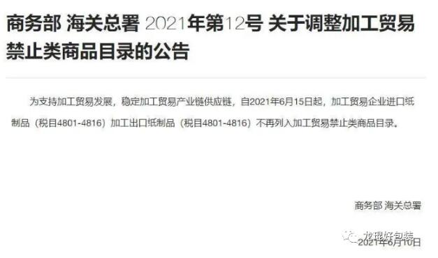 近日,商務(wù)部和海關(guān)總署聯(lián)合發(fā)布公告稱,對紙制品加工貿(mào)易禁止類商品進(jìn)行調(diào)整。自2021年6月15日起,加工貿(mào)易企業(yè)進(jìn)口紙制品(稅目4801-4816)、加工出口紙制品(稅目4801-4816)不再列入加工貿(mào)易禁止類商品目錄。那么,這對造紙行業(yè)將會帶來什么影響呢?