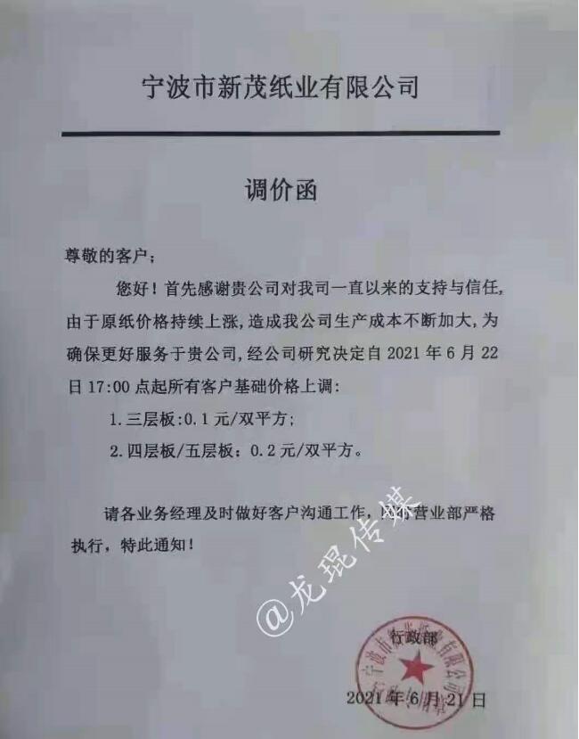 步入6月下旬,平靜許久的紙業包裝市場再起波瀾。有消息稱,6月21日,龍頭紙廠部分基地漲價50-150元/噸。緊接著,福建、浙江、湖北等地紙板價格陸續跟漲。談及此番紙價上漲,很難不讓人將其與近期引起業內外廣泛關注的疫情聯系起來。 6月20日晚,東莞市麻涌鎮新型冠狀病毒肺炎疫情防控指揮部辦公室發布公告:即日起,整個麻涌鎮定為封控區,全鎮各出入口設施圍閉,實行只進不出。而在業內具有極大話語權、擁有近600萬噸產能的玖龍紙業(東莞)有限公司便位于此。 盡管企業可以通過封閉式管理保證人員的安全和正常生產,但是每天生產所需的廢紙、各種化工原料以及成品紙的運輸必然會因此受到一定影響。在此形勢下,廢紙價、紙價、紙板價等上下游企業產品價格的波動也就在所難免。 部分最新紙板漲價函 寧波新茂紙業有限公司 從2021年6月22日17點開始,三層板上漲0.1元/雙平方;四/五層板上漲0.2元/雙平方。