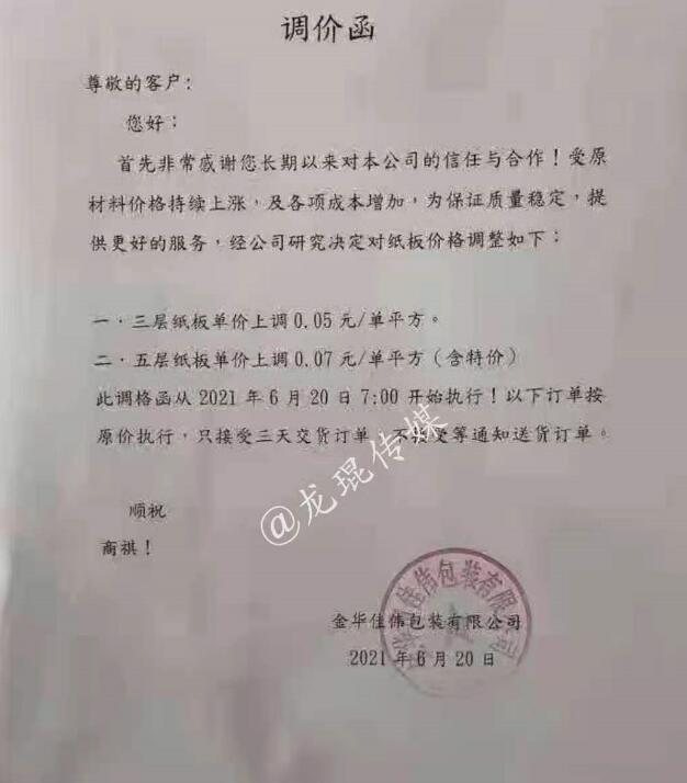 金華佳偉包裝有限公司 從2021年6月20日7點開始,三層紙板單價上漲0.05元/單平方,五層紙板單價上漲0.07元/單平方(含特價)。