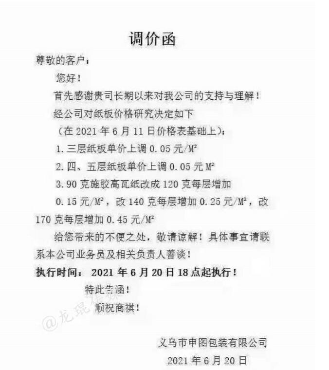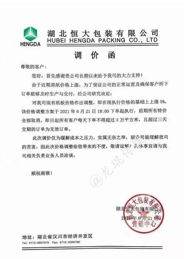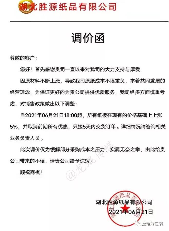 武漢龍發包裝有限公司 從2021年6月21日17點半接單起,紙板價格在現有價格基礎上上漲5%(折扣)。