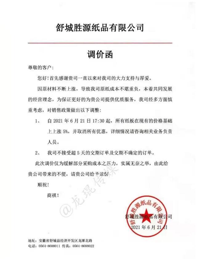 舒城勝源紙品有限公司 從2021年6月21日17點半開始,所有紙板在現有價格基礎上上漲5%。