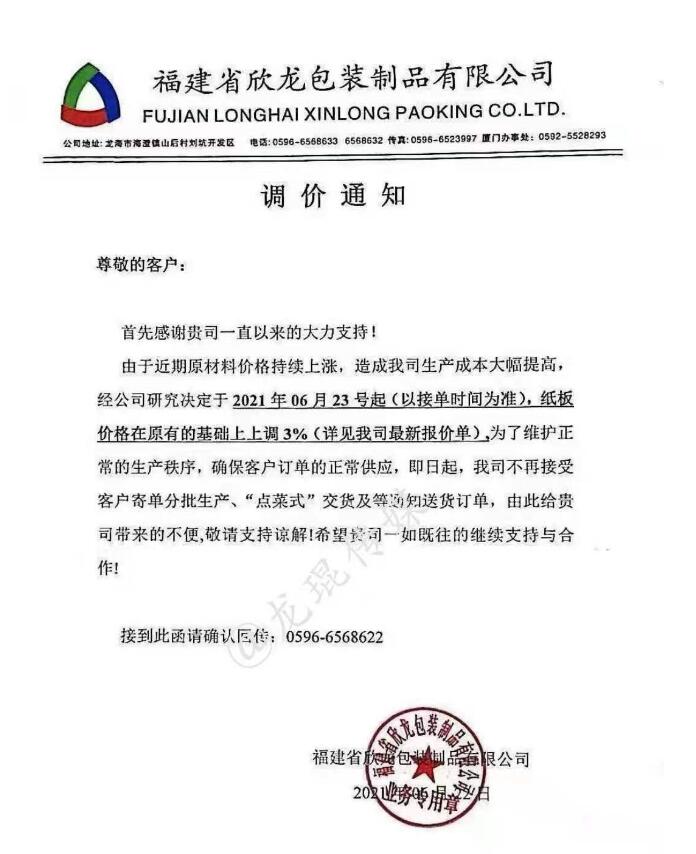 福建省欣龍包裝制品有限公司 從2021年6月23日起,紙板價格在原有基礎上上調3%。