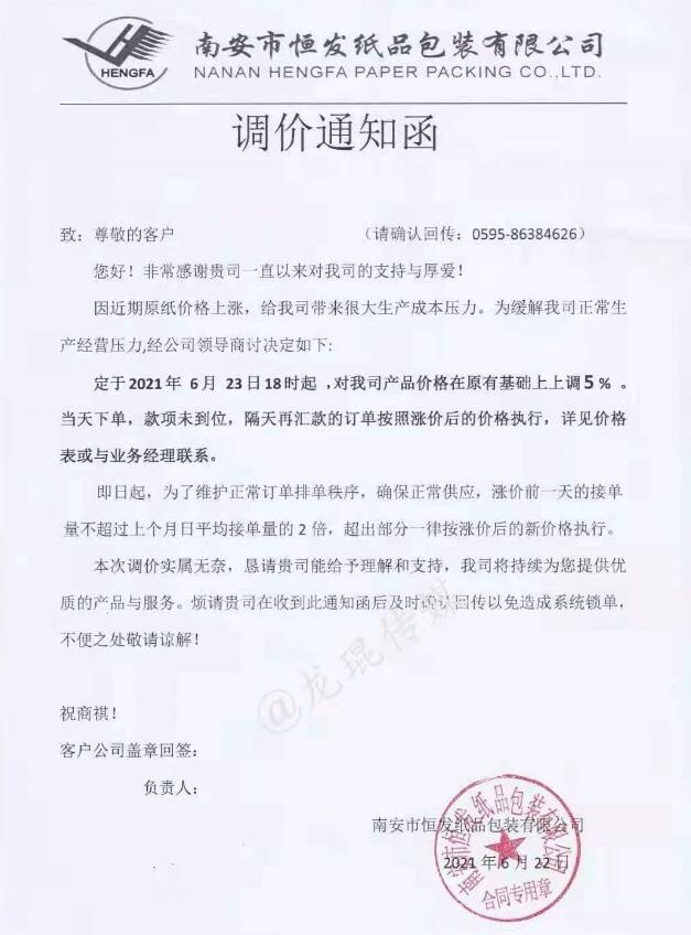南安市恒發紙品包裝有限公司 從2021年6月23日18點開始,產品價格在原有基礎上上漲5%。