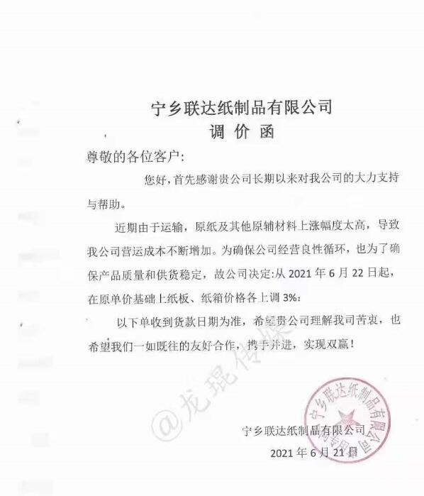 寧鄉聯達紙制品有限公司 從2021年6月22日起,在原單價基礎上紙板、紙箱價格上漲3%。