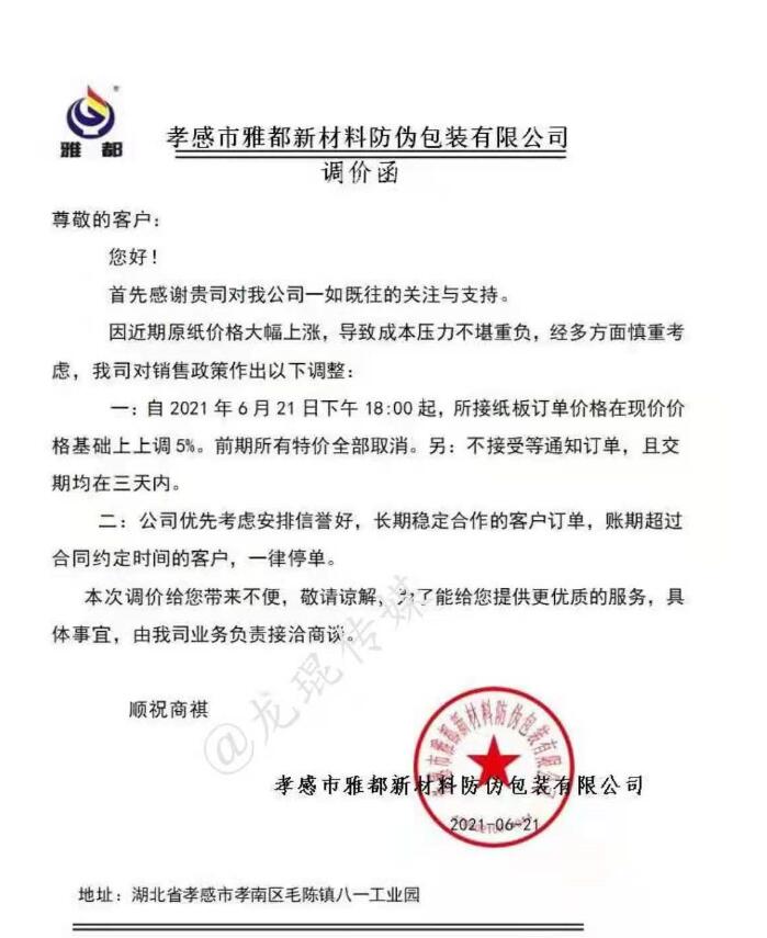 孝感市雅都新材料防偽包裝有限公司 從2021年6月21日下午18點開始,所接紙板訂單價格在現價格基礎上上漲5%,前期所有特價全部取消。