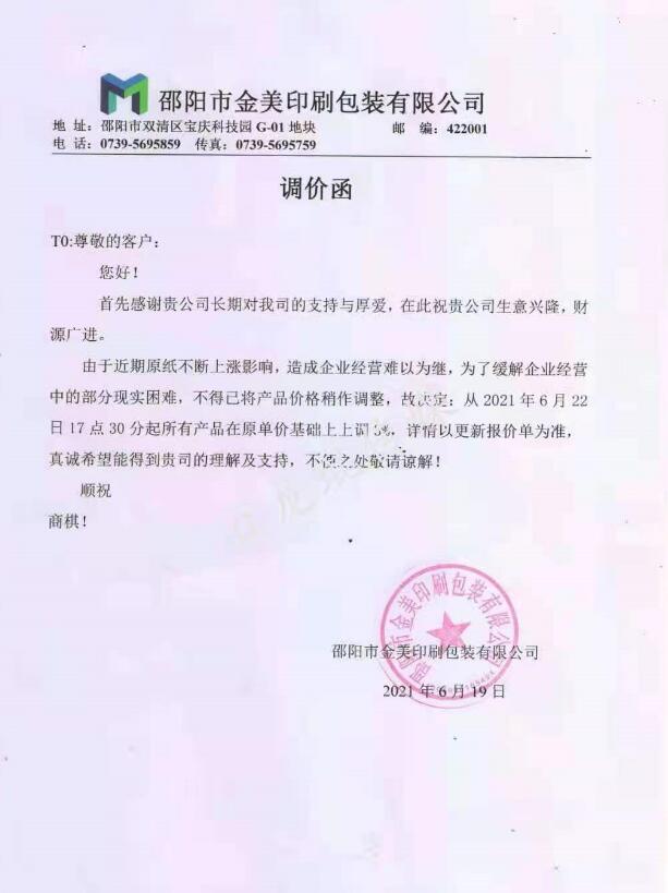 邵陽市金美印刷包裝有限公司 從2021年6月22日17點半起,所有產品在原單價基礎上上漲5%。