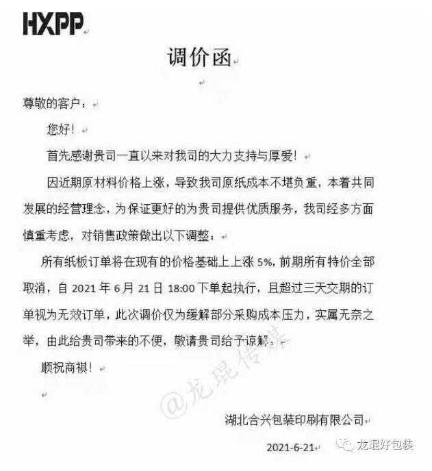 湖北合興包裝印刷有限公司 從2021年6月21日18點下單起上調5%,且超過三天交期的訂單視為無效訂單。
