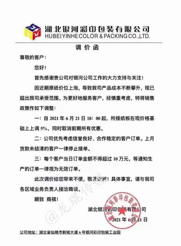 湖北銀河彩印包裝有限公司 從2021年6月21日18點開始,所接紙板在現價格基礎上上漲5%,同時取消前期所有優惠。每個客戶當日訂單金額不得超過10萬元,等通知生產的訂單一律停止接單。