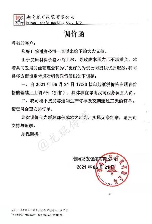 湖南龍發包裝有限公司 從2021年6月21日17點半接單起,紙板價格在現有價格基礎上上漲5%(折扣)。