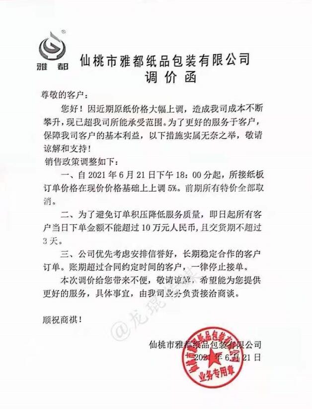 仙桃市雅都紙品包裝有限公司 從2021年6月21日18點開始,所接紙板訂單價格在現價格基礎上上調5%。