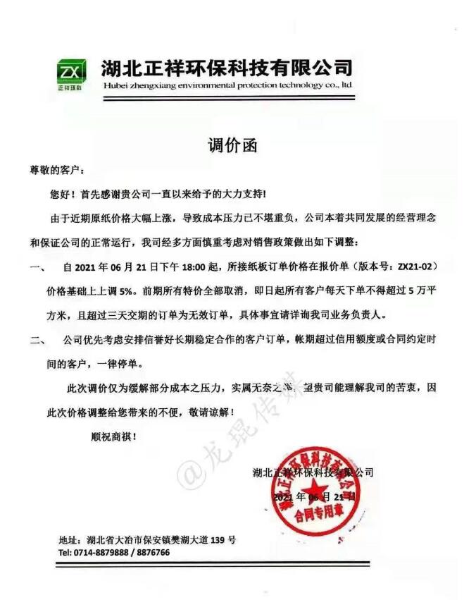 湖北正祥環保科技有限公司 從2021年6月21日18點開始,所接紙板訂單價格在報價單價格基礎上上漲5%;所有客戶每天下單不得超過5萬平方米,且超過三天交期的訂單視為無效訂單。