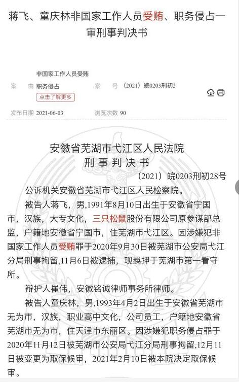 近日,據裁判文書網披露,三只松鼠物流部總參謀蔣某伙同員工童某某,犯非國家工作人員受賄罪與職務侵占罪,涉案金額累計達近140萬。