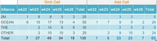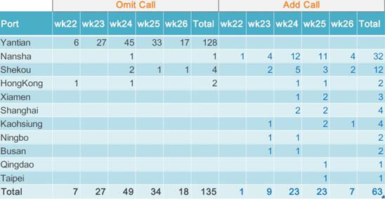 正如預(yù)期的那樣,鹽田港是該地區(qū)受影響最嚴(yán)重的港口,被跳港128次。據(jù)容易船期稱,第24周(6月6日至12日)跳港次數(shù)最多,達(dá)到45次,但在接下來(lái)的兩周內(nèi)逐漸減少。 與此同時(shí),南沙和蛇口作為鹽田的“后備”港口,南沙被加靠了32次,蛇口被加靠了12次。香港跳港2次加靠2次,幾乎沒(méi)有多少影響。