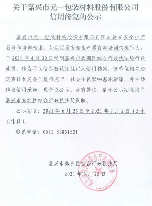 嘉興市元一包裝材料股份有限公司因未建立安全生產教育和培訓檔案,如實記錄安全生產教育和培訓情況行為,于2019年4月30日受到嘉興市秀洲區綜合行政執法局行政處罰,作為不良信息被認定且記入信用檔案。