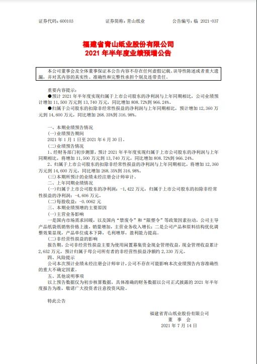 7月14日,青山紙業(600103)發布2021年半年度業績預告:預計2021年半年度實現歸屬于上市公司股東的凈利潤與上年同期相比,將增加11,500萬元到13,740萬元,同比增加808.72%到966.24%。