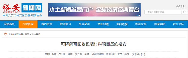 安徽裕安簽約一紙質包裝材料項目 一期投資約1億