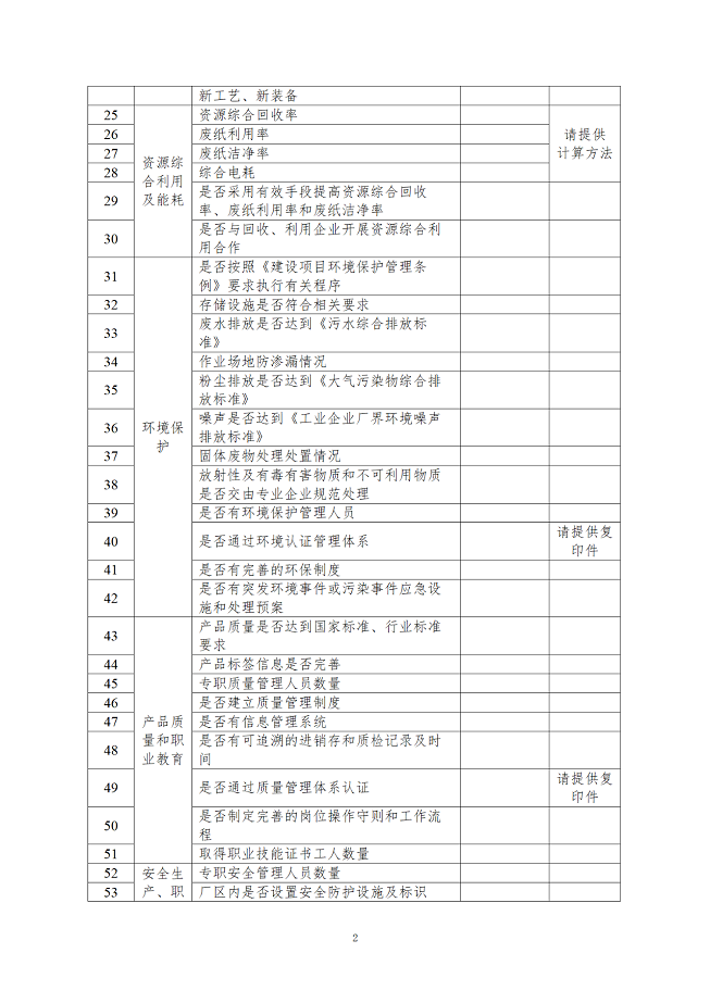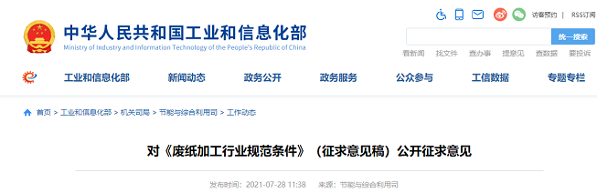 為深入貫徹落實《中華人民共和國循環(huán)經(jīng)濟促進法》《中華人民共和國固體廢物污染環(huán)境防治法》《中華人民共和國土壤污染防治法》,引導廢紙加工行業(yè)高質(zhì)量發(fā)展,提升廢紙集約化加工水平,我們組織編制了《廢紙加工行業(yè)規(guī)范條件》(征求意見稿),現(xiàn)向社會公開征求意見。如有意見或建議,請于2021年8月12日前反饋工業(yè)和信息化部節(jié)能與綜合利用司。 聯(lián)系人:艾崇 電話:010-68205360 傳真:010-68205368 電子信箱:zyzhly@miit.gov.cn 附件:《廢紙加工行業(yè)規(guī)范條件》(征求意見稿).doc 工業(yè)和信息化部節(jié)能與綜合利用司 2021年7月28日 附件 廢紙加工行業(yè)規(guī)范條件 (征求意見稿) 為深入貫徹落實《中華人民共和國循環(huán)經(jīng)濟促進法》《中華人民共和國固體廢物污染環(huán)境防治法》《中華人民共和國土壤污染防治法》,引導廢紙加工行業(yè)高質(zhì)量發(fā)展,提升廢紙集約化加工水平,制訂本規(guī)范條件。 一、總則 (一)本規(guī)范條件中廢紙加工是指按照廢紙的來源用途、分類標準、質(zhì)量要求等,對廢紙進行分類、挑選、除雜、切割、破碎、包裝等加工處理,并將加工后的廢紙作為原料送往造紙等生產(chǎn)制造行業(yè)進行再生利用的過程。廢紙加工企業(yè)(以下簡稱企業(yè))是指從事廢紙加工行業(yè)的企業(yè),不包含以廢紙為原料生產(chǎn)紙漿、紙板及其它后續(xù)產(chǎn)品的利用企業(yè)。 (二)本規(guī)范條件中資源綜合回收率是指統(tǒng)計期內(nèi)分揀后可利用的再生資源總數(shù)量與分揀前廢紙總數(shù)量之比的百分數(shù)。廢紙利用率是指加工后可利用廢紙數(shù)量(即除去不可利用廢紙及雜物)與分揀前廢紙總數(shù)量之比的百分數(shù)。廢紙潔凈率是指加工后可利用廢紙數(shù)量與分揀后的廢紙總數(shù)量之比的百分數(shù)。 (三)本規(guī)范條件適用于在中華人民共和國境內(nèi)(臺灣、香港、澳門地區(qū)除外)已建成的所有類型企業(yè)。 (四)本規(guī)范條件是促進行業(yè)技術進步和規(guī)范發(fā)展的引導性文件,不具有行政審批的前置性和強制性。 二、企業(yè)布局與項目選址 (五)企業(yè)應當符合國家產(chǎn)業(yè)政策和所在地區(qū)城鄉(xiāng)建設規(guī)劃、生態(tài)保護紅線、生態(tài)環(huán)境保護規(guī)劃、土地利用總體規(guī)劃、主體功能區(qū)規(guī)劃等要求,其施工建設應滿足規(guī)范化設計要求。 (六)企業(yè)加工能力應當與本企業(yè)回收規(guī)模相適應。鼓勵企業(yè)進入再生資源或循環(huán)經(jīng)濟園區(qū)經(jīng)營。 (七)企業(yè)不得在自然保護區(qū)、風景名勝區(qū)、飲用水水源保護區(qū)、永久基本農(nóng)田保護區(qū)以及法律、法規(guī)規(guī)定禁止建設的其他區(qū)域內(nèi)違法建設投產(chǎn)。已在上述區(qū)域內(nèi)投產(chǎn)運營的企業(yè)要根據(jù)該區(qū)域規(guī)劃要求,在一定期限內(nèi),通過依法搬遷、轉(zhuǎn)產(chǎn)等方式逐步退出。 三、技術、裝備和工藝 (八)企業(yè)土地使用手續(xù)合法(若土地為租用,合同期限不少于10年),廠區(qū)面積、作業(yè)場地面積應與企業(yè)加工能力相適應,作業(yè)場地應為封閉式廠房,廠區(qū)地面應做硬化處理,應合理規(guī)劃建設原料區(qū)、分揀區(qū)、加工區(qū)、質(zhì)檢區(qū)、成品區(qū)、運輸區(qū)、固體廢物及危險廢物臨時存放區(qū)。 (九)企業(yè)應配備與處理能力相適應,且滿足防火、絕緣特性的的廢紙分揀加工裝備和配套裝卸設備,根據(jù)加工品類配備切膠機、破碎機等輔助加工設備,以及測水儀、電子磅和電子監(jiān)控系統(tǒng)等管理設備。 (十)企業(yè)應配備粉塵、廢水、廢物收集處理等環(huán)境保護設施,以及必備的安全防護、消防設施等。 (十一)企業(yè)應按照相關行業(yè)標準要求進行工藝設置,對廢紙品類等級進行細分,實現(xiàn)廢紙進料、分揀、加工、包裝全流程自動控制,鼓勵采用磁選、風選、破碎等技術提高產(chǎn)品潔凈度。 四、資源綜合利用及能耗 (十二)企業(yè)應對收集的廢紙進行充分分揀,分揀出的塑料、金屬、玻璃和其他再生資源等應妥善回收利用,資源綜合回收率不低于95%。 (十三)企業(yè)應采用有效分揀、分離、拆解手段去除廢紙中混雜的塑料覆膜、石膏填充物、玻璃、泥沙等不可利用雜物,鼓勵企業(yè)采取智能分揀等先進工藝對廢紙進行細分,提高廢紙綜合利用效率和潔凈度,廢紙利用率不低于95%,廢紙潔凈率不低于98%。 (十四)鼓勵企業(yè)與回收、造紙等領域的企業(yè)開展產(chǎn)品信息化溯源和質(zhì)量管理合作,積極參與廢紙分類規(guī)范等國家、行業(yè)標準的制定與實施工作。 (十五)企業(yè)應建立用能考核制度,加強對加工過程的能耗管控,加工生產(chǎn)系統(tǒng)綜合電耗應低于5千瓦時/噸廢紙。鼓勵采用先進適用的節(jié)能技術、工藝及裝備。 五、環(huán)境保護 (十六)企業(yè)應按照《中華人民共和國環(huán)境保護法》《中華人民共和國環(huán)境影響評價法》要求,完成環(huán)境影響報告書(表)審批或環(huán)境影響登記表備案。屬于需辦理環(huán)境影響報告書(表)審批的項目,應嚴格執(zhí)行環(huán)境保護“三同時”制度,落實各項污染防治措施,在項