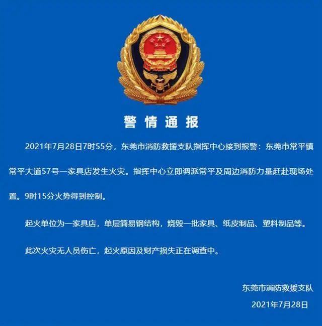 28日上午,東莞市消防救援支隊發(fā)布警情通報稱,上午7時55分,該支隊指揮中心接到報警:東莞市常平鎮(zhèn)常平大道57號一家具店發(fā)生火災。指揮中心立即調(diào)派常平及周邊消防力量趕赴現(xiàn)場處置,上午9時15分火勢得到控制。起火單位為一家具店,單層簡易鋼結構,燒毀一批家具、紙皮制品、塑料制品等。此次火災無人員傷亡,起火原因及財產(chǎn)損失正在調(diào)查中。