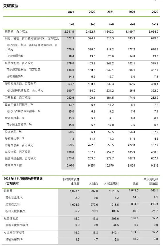 2021年1月-6月(與2020年1-6月相比) 2021年4月-6月(與2020年4-6月相比) 2021年第二季度主要事件 新冠病毒疫情 為阻斷新冠病毒疫情,芬林集團(tuán)在運(yùn)營(yíng)時(shí)優(yōu)先考慮三大事項(xiàng):?jiǎn)T工安全、全員抗疫、業(yè)務(wù)持續(xù)。芬林集團(tuán)嚴(yán)格遵守有關(guān)部門發(fā)布的新冠病毒防疫指南。把盡量減少身體接觸作為最重要的預(yù)防措施。 在疫情期間,芬林集團(tuán)的資源保障保持正常狀態(tài)。除少數(shù)例外情況,生產(chǎn)和交付一直運(yùn)轉(zhuǎn)正常。 7月以來(lái)發(fā)生的事件 胡蘇姆木漿廠于7月份做出一項(xiàng)重大投資決定,將折疊紙板的年產(chǎn)能提高20萬(wàn)噸。該項(xiàng)目投資額約為2.1億歐元,鞏固了芬林紙板作為歐洲折疊紙板領(lǐng)先生產(chǎn)商的地位。結(jié)合胡蘇姆一體化工廠計(jì)劃內(nèi)的年度維護(hù)停工檢修,工程建設(shè)將于2021年10月開始前期工作。預(yù)計(jì)新增產(chǎn)能將于2023年秋季開始爬升,并于2025年底達(dá)到滿額。新增產(chǎn)能將主要投向北美和歐洲市場(chǎng),預(yù)計(jì)這兩塊市場(chǎng)對(duì)芬林紙板的紙板需求將保持增長(zhǎng)。芬林紙板于2021年7月至9月的經(jīng)營(yíng)性利潤(rùn)將計(jì)入的與紙機(jī)有關(guān)的資產(chǎn)減值損失約500萬(wàn)歐元,該項(xiàng)目在財(cái)報(bào)中將對(duì)可比性利潤(rùn)產(chǎn)生影響。 2021年7-9月的利潤(rùn)預(yù)測(cè) 芬林集團(tuán)預(yù)計(jì)2021年7-9月的可比經(jīng)營(yíng)性利潤(rùn)將高于2021年4-6月。 芬林集團(tuán)總裁兼首席執(zhí)行官何亦凱: “芬林集團(tuán)在2021年上半年交出了一份亮眼的答卷。木漿和木材產(chǎn)品于2020年第四季度出現(xiàn)需求和價(jià)格雙增長(zhǎng),并且一直貫穿整個(gè)2021年上半年。紙板業(yè)務(wù)也維持強(qiáng)勁表現(xiàn),本就穩(wěn)健的需求仍持續(xù)增長(zhǎng),導(dǎo)致各大市場(chǎng)的價(jià)格水平亦向上揚(yáng)。生活用紙消費(fèi)品的需求量顯著低于去年水平,疫情的間歇性緩解并未對(duì)專業(yè)產(chǎn)品(商用系列)的需求產(chǎn)生較大影響。 芬林集團(tuán)于2019-2020年度在芬蘭勞馬、瑞典胡蘇姆和芬蘭凱米啟動(dòng)了重大投資項(xiàng)目。這些項(xiàng)目正按計(jì)劃推進(jìn),將于2022年和2023年開始投產(chǎn)。建筑業(yè)回暖,再加上鋼材價(jià)格的急劇攀升,給上述項(xiàng)目帶來(lái)了成本壓力。 胡蘇姆木漿廠于7月份做出一項(xiàng)重大投資決定,將折疊紙板的年產(chǎn)能提高20萬(wàn)噸。芬林集團(tuán)將繼續(xù)發(fā)展核心業(yè)務(wù),包括瑞典瑪麗斯塔德生活用紙廠的前期規(guī)劃,以及將在艾內(nèi)科斯基工廠實(shí)施的木材產(chǎn)品加工發(fā)展計(jì)劃。預(yù)計(jì)相關(guān)投資決策最早在2022年進(jìn)入實(shí)際落實(shí)階段,屆時(shí)項(xiàng)目的環(huán)境許可證和詳細(xì)規(guī)劃也將獲批完成。 芬林之春繼續(xù)致力于開發(fā)新的林業(yè)商機(jī)。自該創(chuàng)新公司成立以來(lái),沿著從原材料到產(chǎn)品的產(chǎn)業(yè)價(jià)值鏈,我們已投資了五個(gè)相關(guān)項(xiàng)目。這些項(xiàng)目旨在借助新業(yè)務(wù)創(chuàng)造新價(jià)值,與芬林集團(tuán)堅(jiān)實(shí)的基礎(chǔ)業(yè)務(wù)單元并駕齊驅(qū)。 芬林之春投資的最大兩個(gè)項(xiàng)目均位于芬蘭艾內(nèi)科斯基,一家是已經(jīng)投入運(yùn)營(yíng)的紡織纖維示范工廠,另外一家是將于今年下半年竣工的3D纖維包裝示范工廠。 氣候變化和生物多樣性的喪失正日益成為全球性問題,制定所有決策時(shí)都必須考慮到如何應(yīng)對(duì)這些挑戰(zhàn)。芬蘭森林作為可再生原材料的主要來(lái)源,支持全球市場(chǎng)對(duì)林紙產(chǎn)品的需求。我們?yōu)闈M足人們的日常生活和健康而生產(chǎn)產(chǎn)品。在產(chǎn)品生產(chǎn)過程中必須高效利用原材料,杜絕浪費(fèi),同時(shí)不使用化石燃料。這需要依靠我們?cè)谛袠I(yè)中的長(zhǎng)期發(fā)展和不斷投入。 林業(yè)運(yùn)營(yíng)應(yīng)著眼長(zhǎng)遠(yuǎn)發(fā)展,不僅要提高木材產(chǎn)量,提升碳結(jié)合力,同時(shí)要采用科學(xué)的方法,以更好地保護(hù)生物多樣性。我們需要采取更多措施來(lái)保護(hù)寶貴的森林生態(tài)系統(tǒng),不斷改進(jìn)和完善商用林的木材加工方法,實(shí)現(xiàn)經(jīng)濟(jì)和生態(tài)效益雙豐收。歐盟在制定相關(guān)法規(guī)和戰(zhàn)略時(shí),以及各國(guó)在做出相關(guān)決策時(shí),都應(yīng)考慮到整個(gè)森林產(chǎn)業(yè)價(jià)值鏈對(duì)氣候和環(huán)境問題以及國(guó)家經(jīng)濟(jì)的重要性。我們?cè)敢鉃樾袠I(yè)發(fā)展貢獻(xiàn)力量。這個(gè)行業(yè)需要一個(gè)可預(yù)知的穩(wěn)定的經(jīng)營(yíng)環(huán)境。"