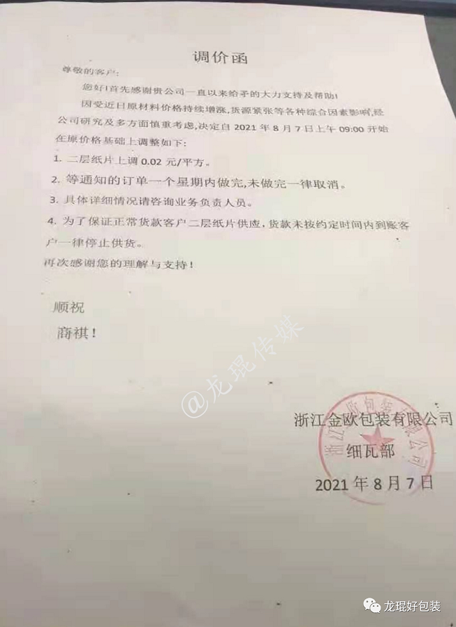浙江金甌包裝有限公司 從8月7日8點開始,三層紙板上調0.03元/平方,四層紙板上調0.05元/平方,五層紙板上調0.05元/平方。