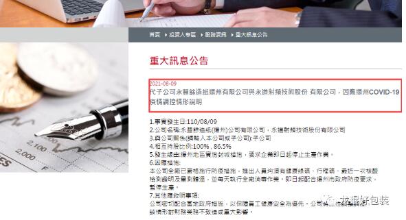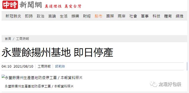 近期,由于江蘇揚州疫情升溫,當地有包裝企業反映,公司已處于半停產狀態。8月9日,永豐余投資控股有限公司(以下簡稱:永豐余)也發布公告稱,其位于揚州的兩家子公司——永豐余造紙(揚州)有限公司與永道射頻技術股份有限公司為配合疫情防控要求,即日起停止生產。