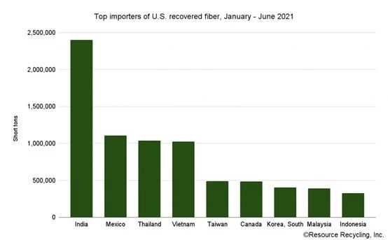 美國2021年前6個月回收纖維出口量同比顯著增加,出口國主要為印度和泰國。 據(jù)美商務(wù)部人口普查局上周發(fā)布的2021年1-6月的出口數(shù)據(jù)顯示,回收纖維出口量從2020年上半年的740萬噸躍升至今年的900萬短噸,但仍低于2020年之前的數(shù)據(jù)。 數(shù)據(jù)顯示,印度向美國進口回收纖維總量大幅增加,2021年上半年,進口總量達240萬短噸,是同期美國廢纖維出口總量的大頭,占1/4以上。而2020年上半年,該國進口了97萬短噸美國回收纖維。 2021年上半年,從美國進口回收纖維的主要國家和地區(qū)還有墨西哥(110萬短噸)、泰國(104萬短噸)、越南(102萬短噸)、臺灣(49萬短噸)、加拿大(48.3萬短噸)、韓國(40.3萬短噸)、馬來西亞(39萬短噸)和印度尼西亞(32.6萬短噸)。 泰國對美廢進口的增幅也較大,2021上半年比2020年同期進口的28.8萬短噸增加了260%。 當(dāng)?shù)匦袠I(yè)人士表示,這些國家和地區(qū)的進口量增長正在緩和中國禁廢令對美國廢紙回收業(yè)的影響,預(yù)計還將給全球纖維出口市場留有較大的空間。但與中國禁廢令的最后一個時期——2017年上半年的出口量相比,2021年美國向中國的廢纖維總出口量下降了12%,當(dāng)前再生纖維已被正式禁止進口到中國。而在2017年,中國占美國所有纖維出口的66%,而今年同期,中國僅占美國纖維出口的3%。