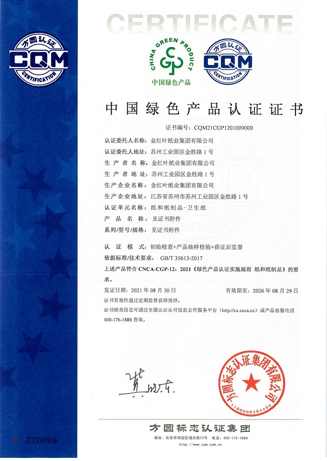 該批獲得認證的中國綠色產品包括了衛生紙、面巾紙、餐巾紙、紙手帕、濕巾等多規格多系列產品,充分表明了集團踐行綠色高質量發展戰略的堅定決心和努力。