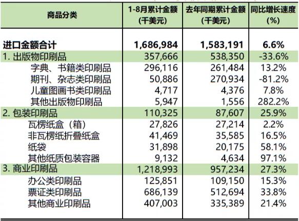 國內印刷品進出口概況 2021年1-8月國內印刷品進口16.87億美元,同比增長6.6%(詳見表2)。其中,出版物印刷品進口3.58億美元(同比下降33.6%),包裝印刷品進口1.10億美元(同比增長25.9%),商業印刷品進口12.19億美元(同比增長27.3%)。 相關印刷品主要子項進口,字典書籍類印刷品2.96億美元(同比增長13.2%),期刊雜志類印刷品5088.6萬美元(同比下降81.2%),兒童圖畫書類印刷品471.7萬美元(同比增長7.8%),瓦楞紙盒(箱)2782.6萬美元(同比增長2.2%),非瓦楞紙折疊紙盒4146.9萬美元(同比增長16.5%),紙袋3189.8萬美元(同比增長58.1%),辦公類印刷品1.26億美元(同比增長15.3%),票證類印刷品6.86億美元(同比增長33.8%),其他商業印刷品4.07億美元(同比增長21.4%)。 表2 2021年1-8月 國內印刷品進口統計