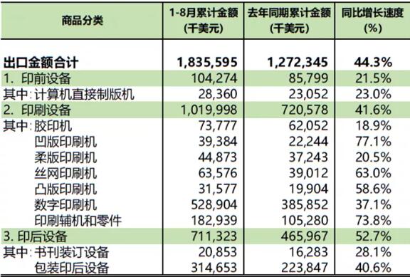相關印刷品主要子項出口,字典書籍類印刷品7.29億美元(同比增長25.4%),期刊雜志類印刷品501.8萬美元(同比增長36.9%),兒童圖畫書類印刷品4.94億美元(同比增長17.4%),瓦楞紙盒(箱)12.20億美元(同比增長34.2%),非瓦楞紙折疊紙盒13.93億美元(同比增長44.7%),紙袋10.23億美元(同比增長37.3%),辦公類印刷品20.00億美元(同比下降5.5%),票證類印刷品7885.3萬美元(同比增長180.9%),其他商業印刷品14.11億美元(同比下降36.5%)。 同期,國內印刷品進出口貿易順差74.79億美元(同比增長7.1%)。 國內印刷裝備進出口概況 2021年1-8月國內印刷裝備進口16.78億美元,與去年同期相比增長57.5%(參見表4)。其中,印前設備進口0.40億美元(同比增長24.5%),印刷設備進口14.70億美元(同比增長59.4%),印后設備進口1.68億美元(同比增長51.7%)。 表4 2021年1-8月 國內印刷裝備進口統計