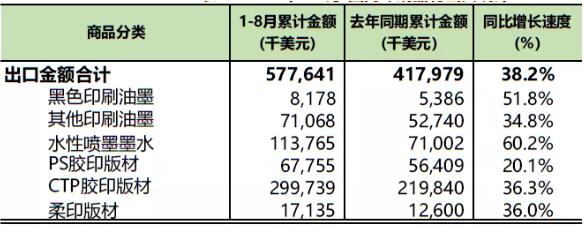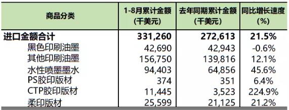 相關設備主要子項出口,計算機直接制版機2836.0萬美元(同比增長23.0%),膠印機7377.7萬美元(同比增長18.9%),凹版印刷機3938.4萬美元(同比增長77.1%),柔版印刷機4487.3萬美元(同比增長20.5%),絲網印刷機6357.6萬美元(同比增長63.0%),凸版印刷機3157.7萬美元(同比增長58.6%),數字印刷機5.29億美元(同比增長37.1%),印刷輔機和零件1.83億美元(同比增長73.8%),書刊裝訂設備2085.3萬美元(同比增長28.1%),包裝印后設備3.15億美元(同比增長40.6%)。 同期,國內印刷裝備進出口貿易順差1.58億美元(同比下降23.8%)。 國內印刷器材進出口概況 2021年1-8月國內印刷器材進口3.31億美元,同比增長21.5%(詳見表6)。其中,黑色印刷油墨1262.67噸、4269.0萬美元(同比下降0.6%),其他印刷油墨5883.12噸、1.57億美元(同比增長12.1%),水性噴墨墨水4880.88噸、9440.3萬美元(同比增長45.6%),PS膠印版材1.74萬平方米、37.4萬美元(同比增長6.4%),CTP膠印版材271.62萬平方米、1144.5萬美元(同比增長224.9%),柔印版材47.33萬平方米、2559.9萬美元(與上年增長21.2%)。 表6 2021年1-8月 國內印刷器材進口統計