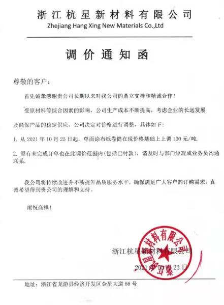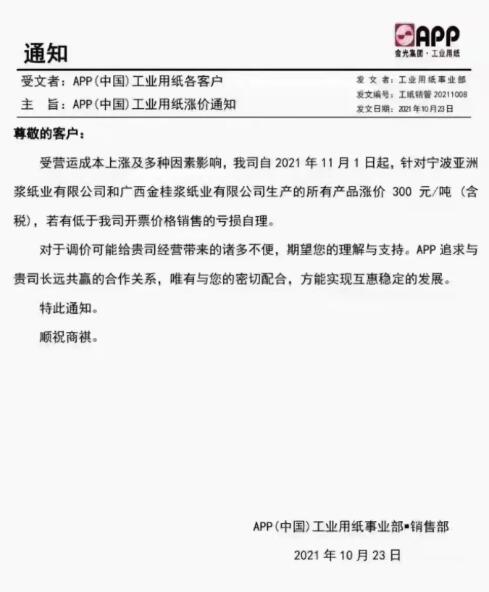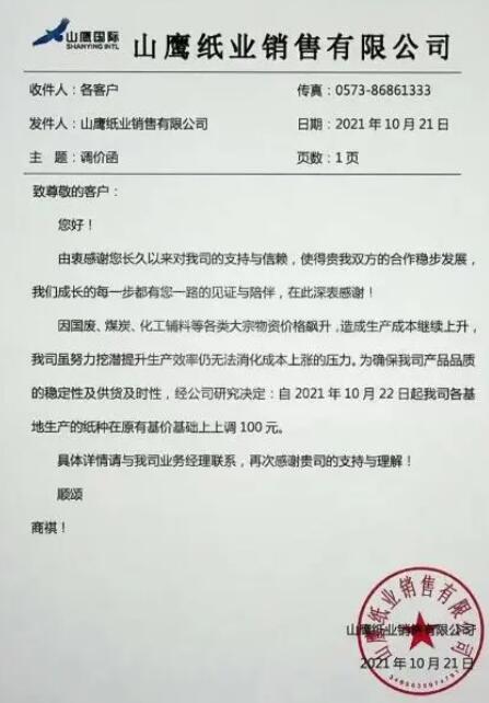 沒(méi)有意外,工業(yè)原紙和紙板又開(kāi)始漲價(jià)了。10月21日,山鷹發(fā)布漲價(jià)函,各基地全系列漲價(jià)100元/噸。