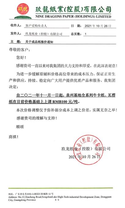 泉州玖龍:11月1日起,全系列牛卡紙、瓦楞紙漲價100元/噸。
