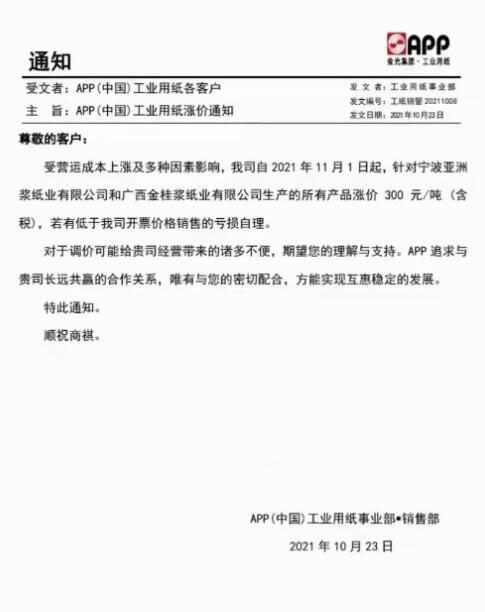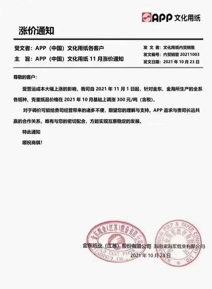 APP(中國)文化用紙 自2021年11月1日起,針對金東、金海所生產的全系各紙種、克重紙品價格在10月基礎上漲價300元/噸(含稅)。